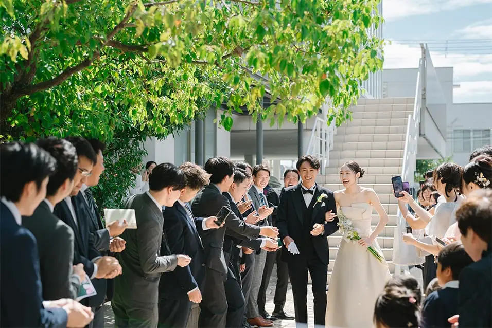 セレモニーのフィナーレ。ゲストの「おめでとう」の声と笑顔が溢れるフラワーシャワーは、チャペルに隣接する外階段をゲストの皆様の待つガーデンへと辿りながら。
