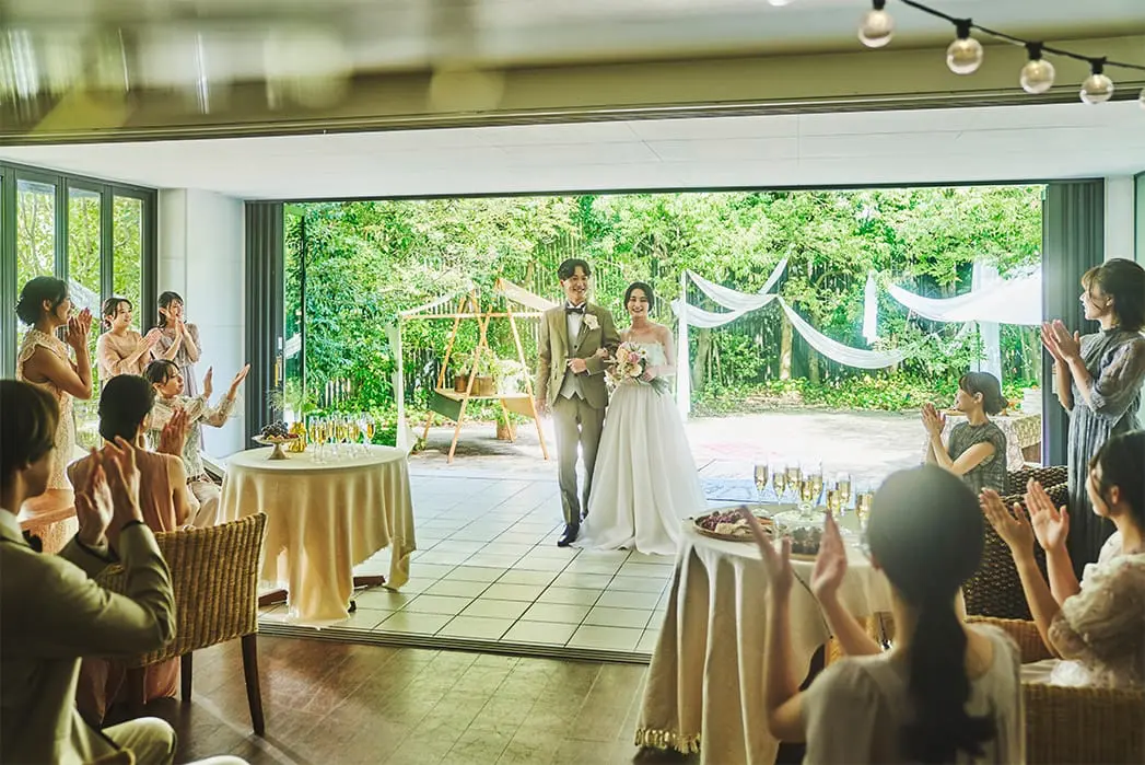 ガーデンでのウェルカムパーティやお色直しの登場、デザートブッフェなど、