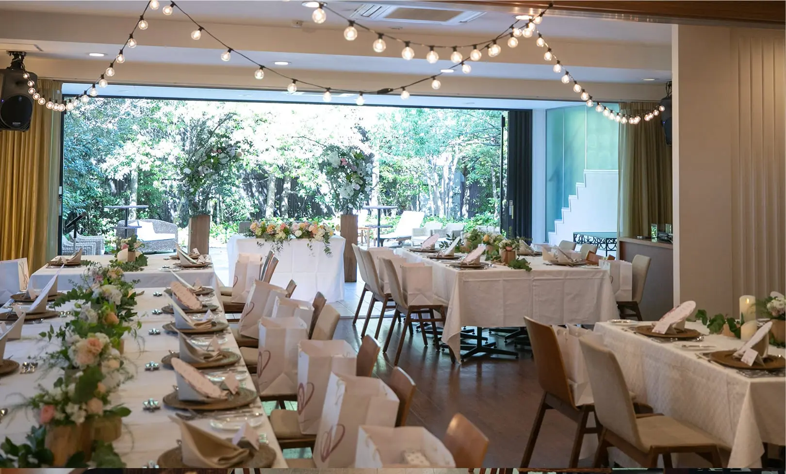 90名を収容できるメインホールは、ガーデンの豊かな緑を望み、大きな窓からは陽光も差し込む明るい空間。
